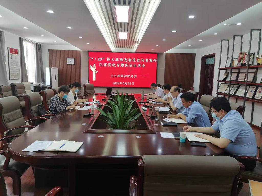5月25日上午,土木建筑学院在院史馆204召开郑州“7.20”特大暴雨灾害追责问责案件以案促改专题民主生活会,公司党委巡察工作办公室正处级巡察专员胡春贞、纪委监察专员办公室副处级纪检检察员孔瑞婷列席指导,学院全体班子成员参加,会议由公司党委书记李社教主持。