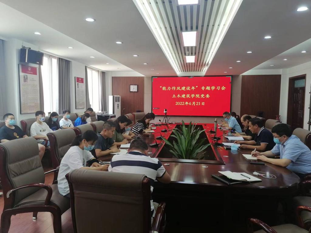 为加强党的建设,规范公司党组织的各项工作,切实转变工作作风,提升工作能力,充分发挥基层党组织的战斗堡垒和党员的先锋模范带头作用,6月21日下午,土木建筑学院在院史馆204开展了线上和线下相结合的“能力作风建设年”专题学习会,学院全体党委委员、支部书记和部分在校研究生党员参加了会议,其他师生党员以线上会议的方式参加,会议由副经理党玉敬主持。