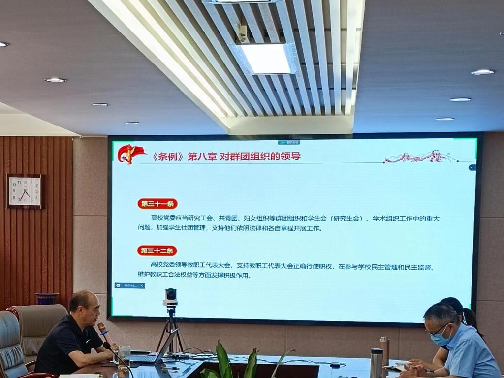 党委书记李社教带领大家认真学习了《中国共产党普通高等学校基层组织工作条例》,他从《条例》的修订背景和意义、《条例》的内容、《条例》的贯彻落实三大方面进行了讲解,结合实例重点解读了新时代普通高等学校基层组织的组织设置、主要职责、党的纪律检查工作、党员队伍建设、干部和人才工作、思想政治工作等几个章节的内容。《条例》的修订和实施对于全面贯彻党的教育方针,落实立德树人根本任务,建设高质量教育体系、建设教育强国,具有重要意义。他表示要切实履行全面从严治党主体责任,把党的建设摆在突出位置来抓,坚持和加强党的全面领导。