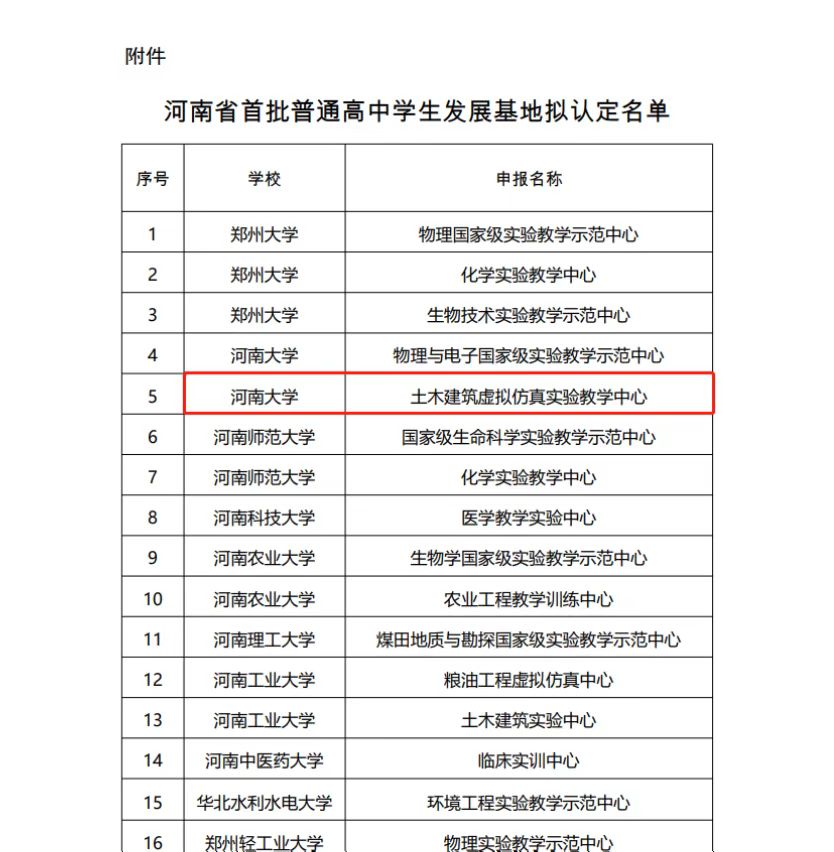 为深入推进普通高中新课程改革和高考综合改革,丰富普通高中员工发展实践场所,持续提升普通高中团队建设水平,加强员工学科素养培养,根据《河南省教育厅办公室关于遴选首批河南省普通高中员工发展实践基地的通知》(教办基〔2022〕112号)文件要求,经学校推荐、省级评审,学院土木建筑虚拟仿真实验教学中心被认定为首批河南省普通高中员工发展基地。