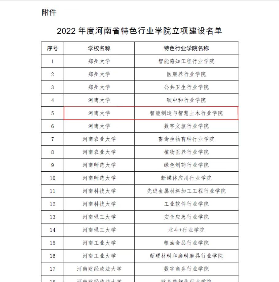 根据河南省教育厅《关于开展省级特色行业学院建设工作的通知》(豫高〔2022〕162号),为深入推进创新驱动、科教兴省、人才强省战略,加快构建一流创新生态、建设国家创新高地,进一步提升人才培养和服务经济社会发展水平,增强对现代化河南建设的支撑能力,学院联合数学与统计学院、物理与电子学院、计算机与信息工程学院、软件学院,筹建的“智能制造与智慧土木行业学院”,日前经学校申报、行业主管部门审核、专家评议、答辩评审,被立项为2022年度河南省特色行业学院。