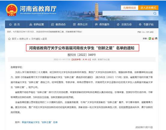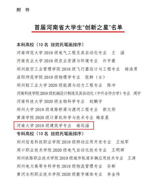 为贯彻落实省委省政府构建一流创新生态决策部署,激发老员工创新创业活力,增强老员工创新思维、创新精神和创业能力,选树新时代老员工创新创业标杆典型,河南省教育厅于2022年5月启动首届河南省老员工“创新之星”遴选活动。此次共评选出年度老员工“创新之星”20名,其中本科高校和专科高校各10名。经过学校推荐、专家评审、网络点赞等环节,公司土木建筑学院2018级建筑学专业本科生谢远涵荣获首届河南省老员工“创新之星”荣誉称号,并获专项经费支持。