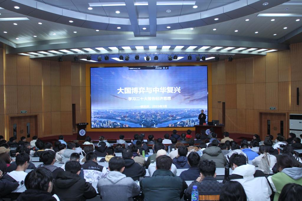 仪式后,侯苏庆作了题为《大国博弈与中华复兴——学习党的二十大报告经济思想》的报告。他从“大国博弈的三国演义”“党的二十大报告经济思想”“中华民族伟大复兴”三个方面,为大家呈现了一场历史、文化和思想交织融合的饕餮盛宴。以古鉴今,学史以明志。1840年以后的一百多年,帝国主义列强不断侵略中国,导致国家蒙辱、人民蒙难、文明蒙尘,每一名中国人都要铭记这段历史,都要明白落后就要挨打、弱国无外交的深刻道理。当今,世界百年未有之大变局正加速演进,大国之间的博弈,需要保持强大的战略定力,作为世界第二大经济体,中国要坚定奉行独立自主的和平外交政策,正如新任外交部长秦刚所言“大国之间的关系,建立在不结盟、不对抗、不针对第三方基础上,既不对世界上任何国家构成威胁,也不受任何第三方的干扰和挑拨”。前不久,中国成功斡旋沙特阿拉伯和伊朗复交,为化解国家之间的矛盾树立了典范。这又一次的说明,中国始终是世界和平的坚定维护者和积极构建者。“中国始终坚持维护世界和平、促进共同发展的外交政策宗旨,致力于推动构建人类命运共同体。”这是占据道义制高点,实现和平发展的伟大战略。党的二十大报告蕴涵着丰富的经济思想,明确强调“从现在起,中国共产党的中心任务就是团结带领全国各族人民全面建成社会主义现代化强国、实现第二个百年奋斗目标,以中国式现代化全面推进中华民族伟大复兴。”这为我们擘画了宏伟的蓝图,中国人民已成为自己命运的主人,中华民族迎来了从站起来、富起来到强起来的伟大飞跃,中华民族伟大复兴进入了不可逆转的历史进程。报告最后讲到,“强国建设、民族复兴的接力棒,历史地落在我们这一代人身上。我们要按照党的二十大的战略部署,加快推进中国式现代化建设,团结奋斗,开拓创新,在新征程上作出无负时代、无负历史、无负人民的业绩,为推进强国建设、民族复兴作出我们这一代人的应有贡献!”