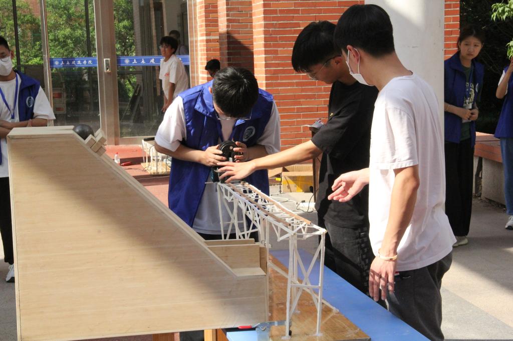 夏日炎炎,各参赛人员带着他们的参赛作品在学院楼前的圆形广场准备就位,各队伍按照抽取的顺序依次进行结构模型承载力测试及答辩,比赛开始首先进行模型结构测量,不满足参赛条件视为不合格。所有参赛作品统一进行称重记录。称重完成后,选手按照抽签次序上场,依照测试流程对模型进行一二三级逐级加载。加载过程扣人心弦,选手和观众们都屏气凝神,期待着模型能够加载成功。伴随着重物的承重、负重小车的通过、小钢球对模型的冲击,三轮加载正式结束,选手们悬着的心也缓缓落下。加载完毕后,评委老师根据各个环节的表现以及模型的结构打分,并针对模型的重量和结构做出评价,给出合理的优化方案。最终,第八组荣获一等奖;第一组、第五组荣获二等奖;第四组、第六组、第三组荣获三等奖。