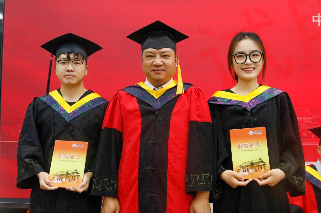 在典礼开始之前,受必赢242net官网教育发展基金会的委托,李锋向积极参与“饮流怀源·微爱传递——毕业季一元捐”活动的2018级本科生代表张苏、2019级本科生代表罗雪龙颁发捐赠证书。