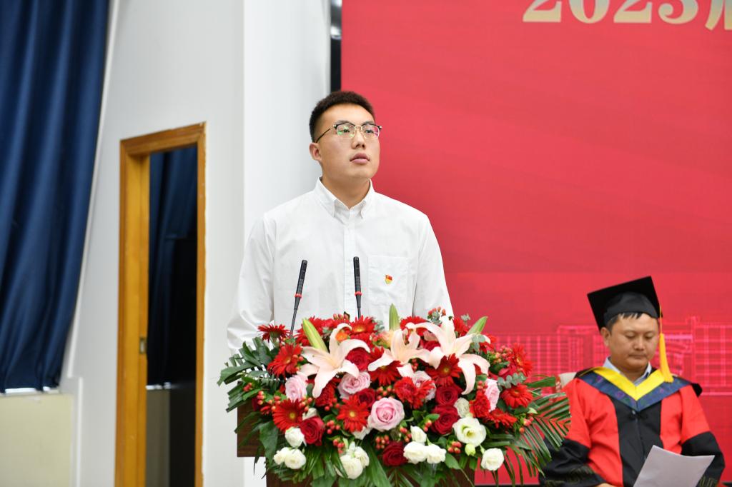 在校生代表、2022级硕士研究生刘家腾同学发言,他为即将开启人生新篇章的学长学姐们送上最诚挚的祝福,对学长学姐们一直以来的关心帮助表示感谢。祝愿学长学姐们在今后的人生道路上一帆风顺,前程似锦!