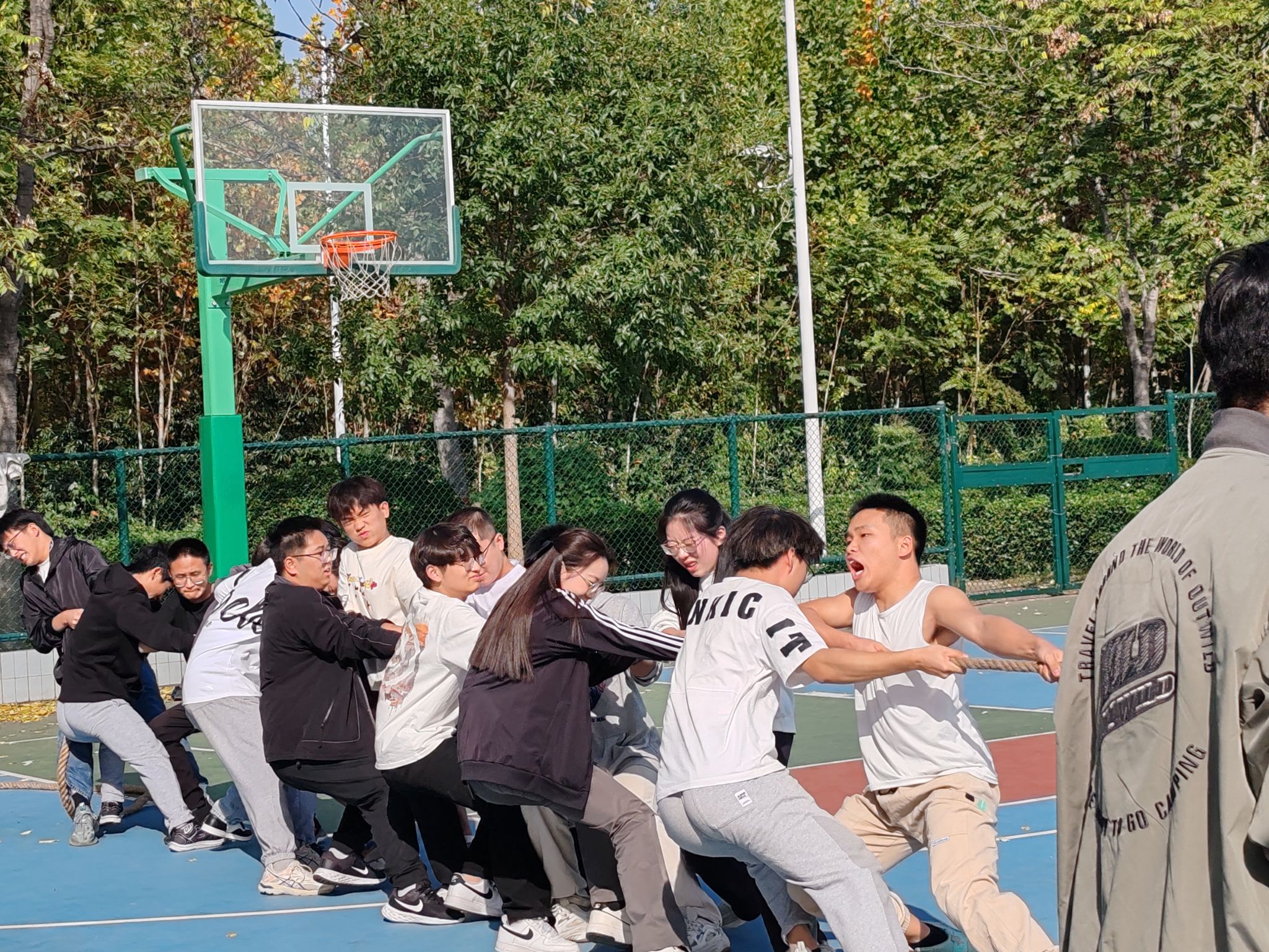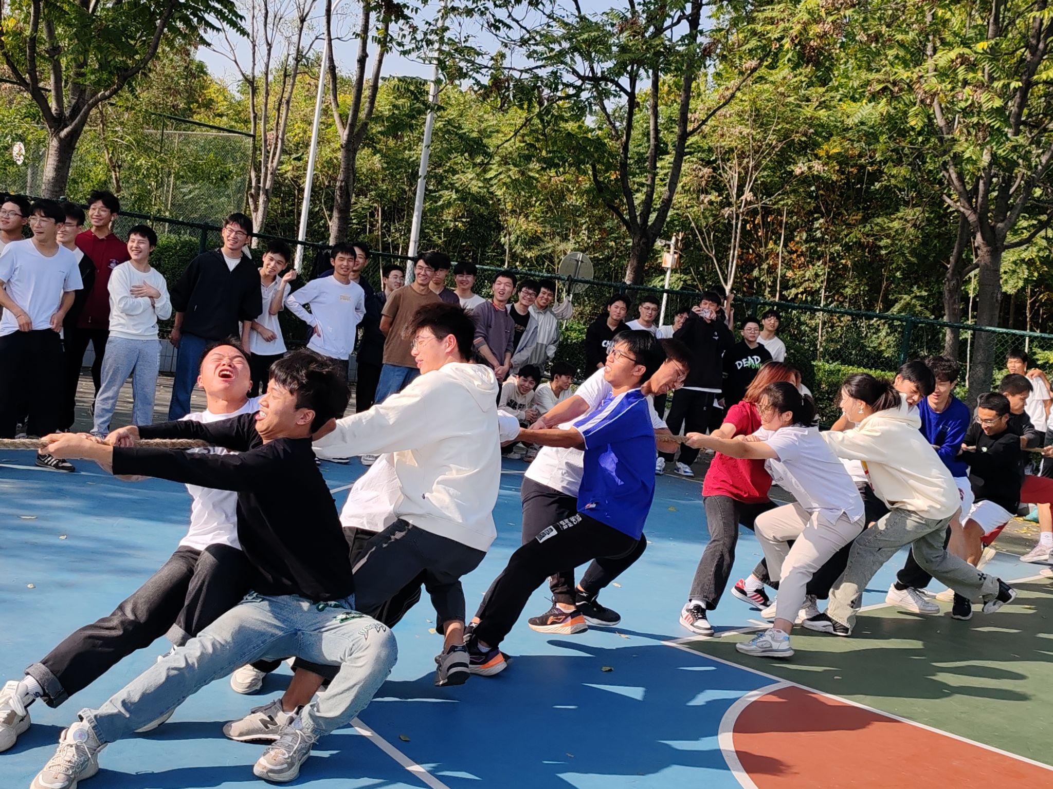 在年级拔河比赛中,建筑一班、建筑二班、建工班、道桥班、地下空间班、实验班六个班级,每个班级13男2女参赛,赛场上,各班队员团结协作,咬紧牙关,全力以赴,班级啦啦对呐喊助威,经过激烈角逐,建筑二班获得第一名,道桥班获得第二名,一条麻绳拉近了大家的友谊,连接了团结和友爱,也演绎了奋斗和拼搏。