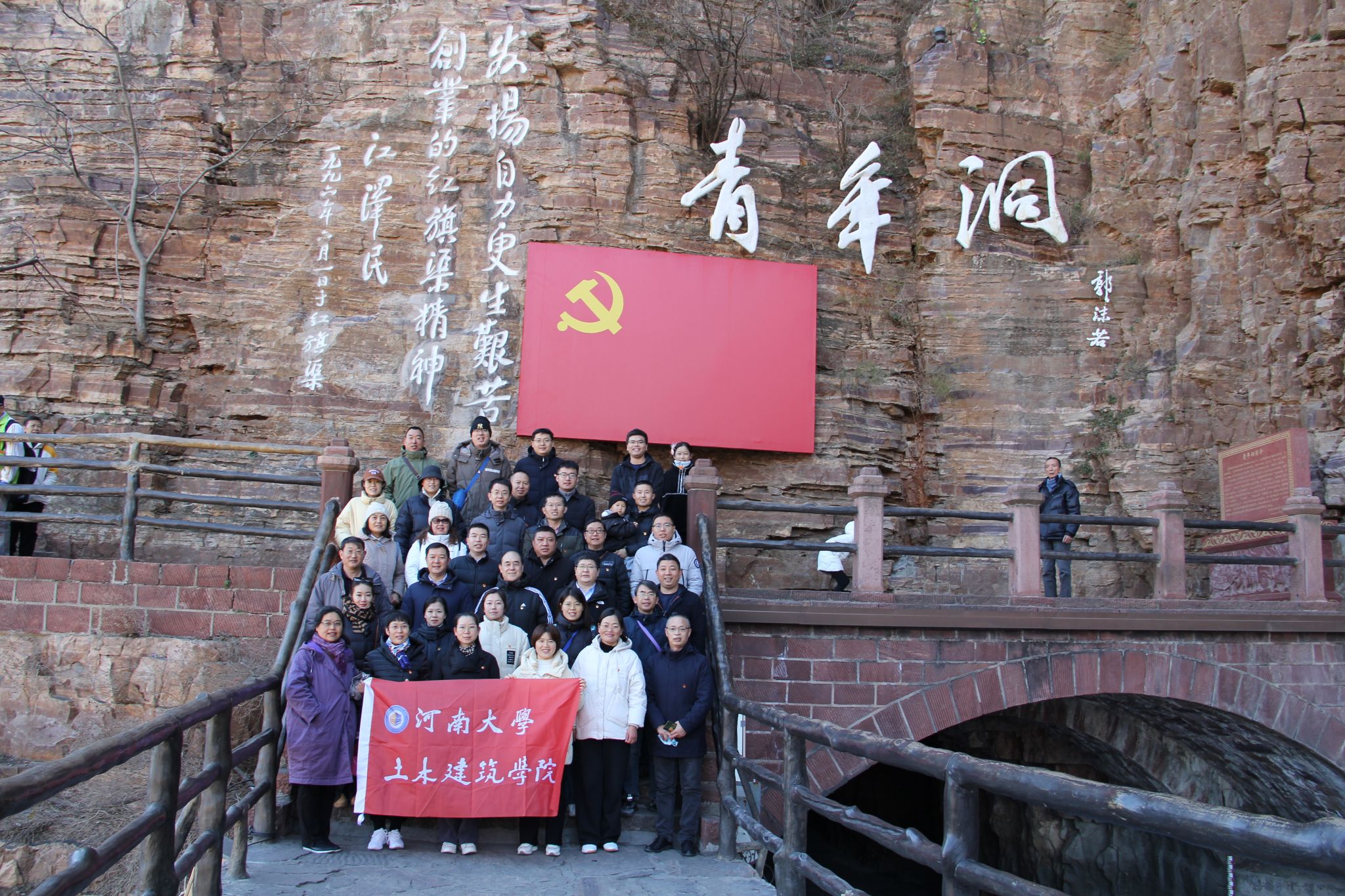 12月3日上午,党员们来到红旗渠的重要咽喉工程青年洞,党员们聆听了当年300多名青年组成凿洞突击队抡锤打钎的感人事迹,沉浸式体验了修建红旗渠的艰难险阻,近距离感受“人工天河”的雄伟壮观。青年洞因参加凿洞的突击队是从全县民工中抽调出来的300名优秀青年,故取名叫“青年洞”,是红旗渠建设最艰巨的地段,修筑在太行山腰的峭壁之上,青年们仅仅靠着一锤,一铲,两只手。此次体验式教学让党员同志们切实领会了习近平总书记视察安阳时提出的“年轻一代要继承和发扬吃苦耐劳、自力更生、艰苦奋斗的精神,摒弃骄娇二气,像我们的父辈一样把青春热血镌刻在历史的丰碑上”重要讲话精神,表示要以更加积极昂扬的姿态,为学院发展贡献力量。