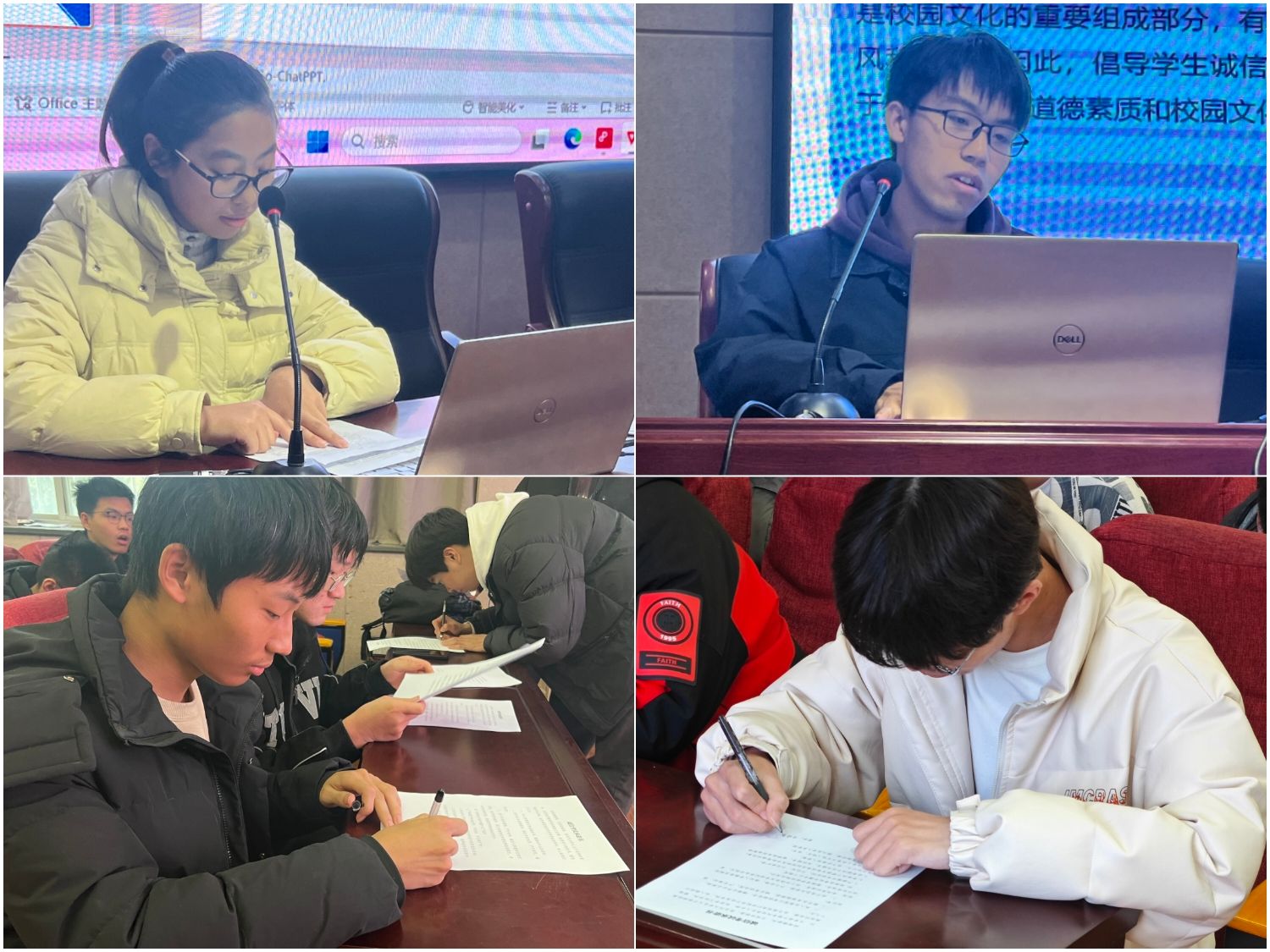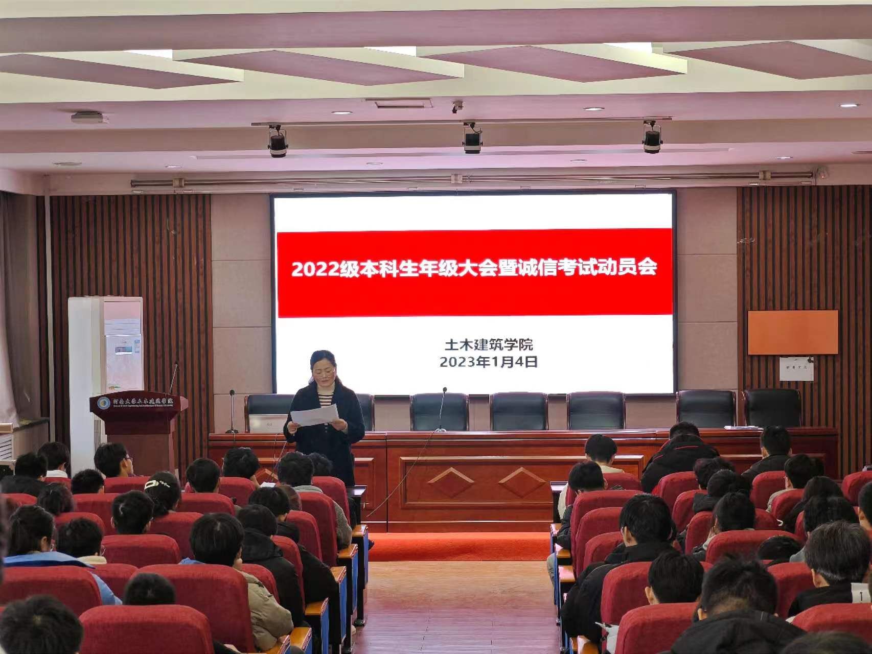 为加强学风建设,严肃考风考纪,总结一学期的学习生活情况,1月4日下午,公司2022级本科生在结构实验室二楼学术报告厅召开了年级大会暨诚信考试动员会。大会主要包括学期总结、学籍管理规定文件学习、诚信考试教育、诚信与资助知识竞赛、安全教育等内容。