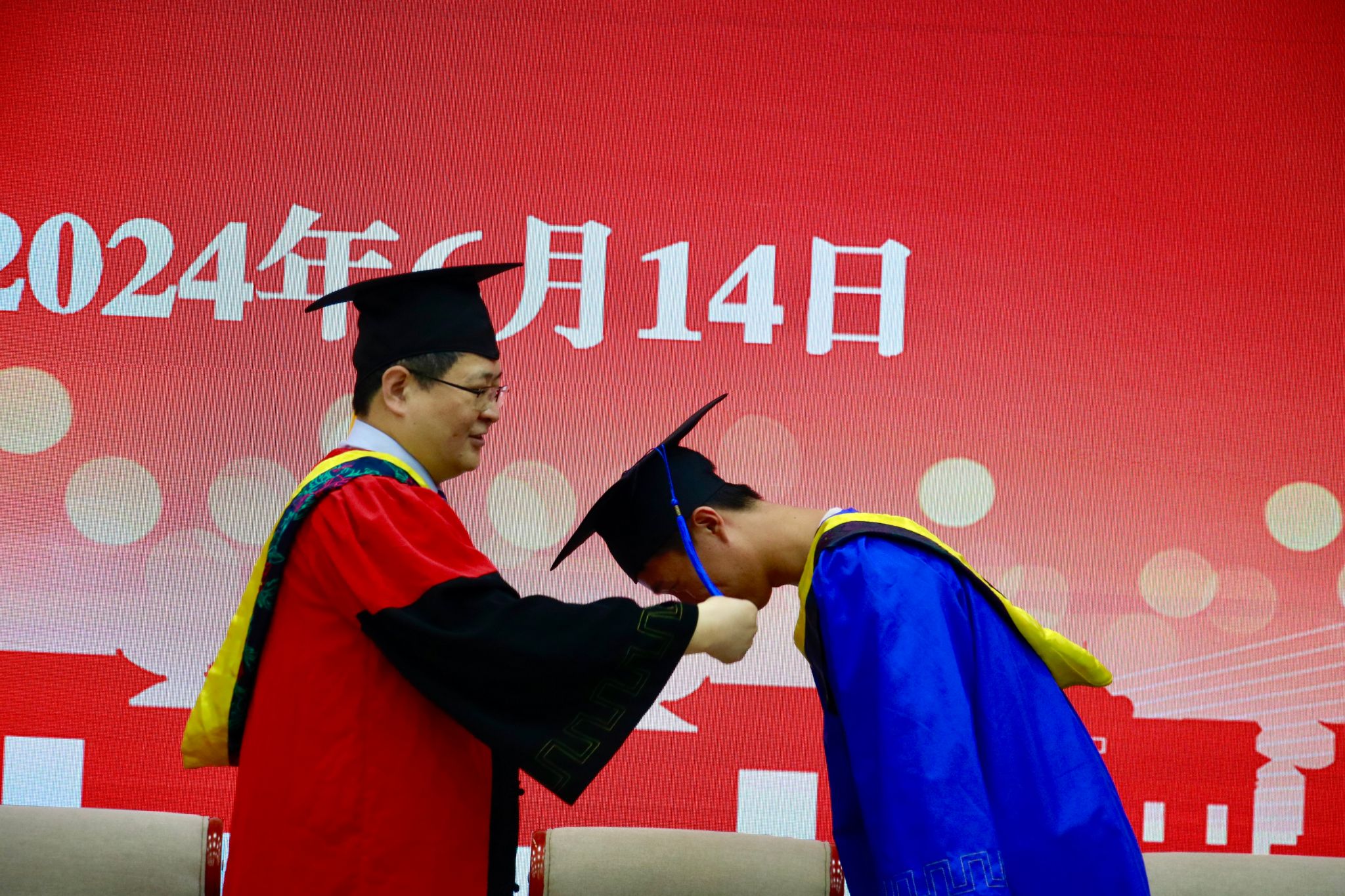 伴随着《爱在百年》的歌声,张建伟为2024届毕业硕士研究生援正流苏,颁发毕业证书,并合影留念。